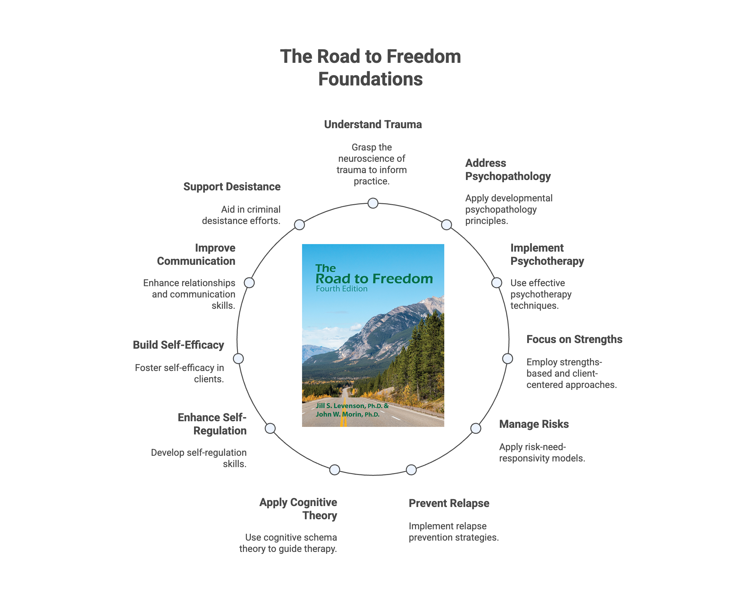 The Road to Freedom is solidly grounded in the latest best practices in the field. It is informed by literature about the neuroscience of trauma, developmental psychopathology, principles of effective psychotherapy, strengths-based and client-centered practices, the risk-need-responsivity model, relapse prevention, cognitive schema theory, self-regulation, self-efficacy, relationships and communication skills, and criminal desistance.